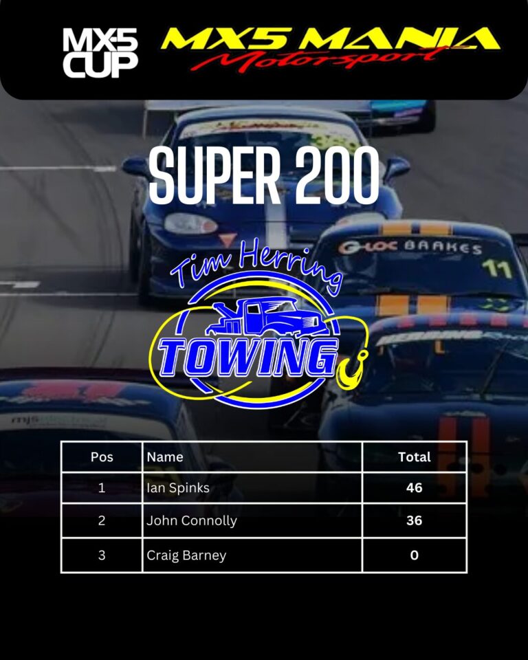 - Super 200 (Tim Herring Towing): Ian Spinks leads on 46 points, with John Connolly next on 36