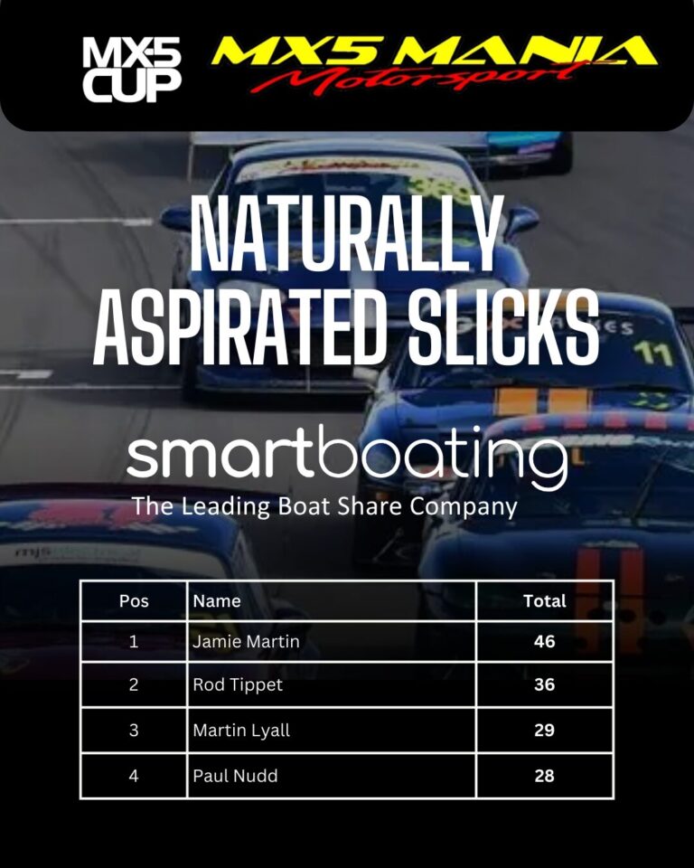 - Naturally Aspirated Slicks (Smart Boating): Jamie Martin leads on 46 points, ahead of Rod Tippett on 36